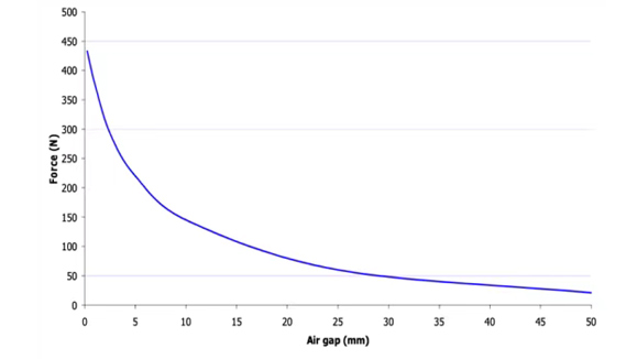 在磁体的应用中,磁通量或磁通密度是衡量其性能的重要指标(尤其是在电机中),但在某些应用领域,如磁力分选、打捞等,磁通量不是一个能有效衡量分选或吸附效果的量,磁吸力是更有效的指标。磁吸力是指磁体能够吸附起来的铁磁物质的重量,它受磁体的性能、形状、尺寸和吸附距离等因素的共同影响,并没有一个数学公式能够计算某磁体的吸力大小,但我们可以通过磁吸力测量装置来测量磁吸力值(一般是测量磁体拉力,再转换为重量),如下图。 磁体的吸力会随被吸附物体的距离增大而逐渐减小。